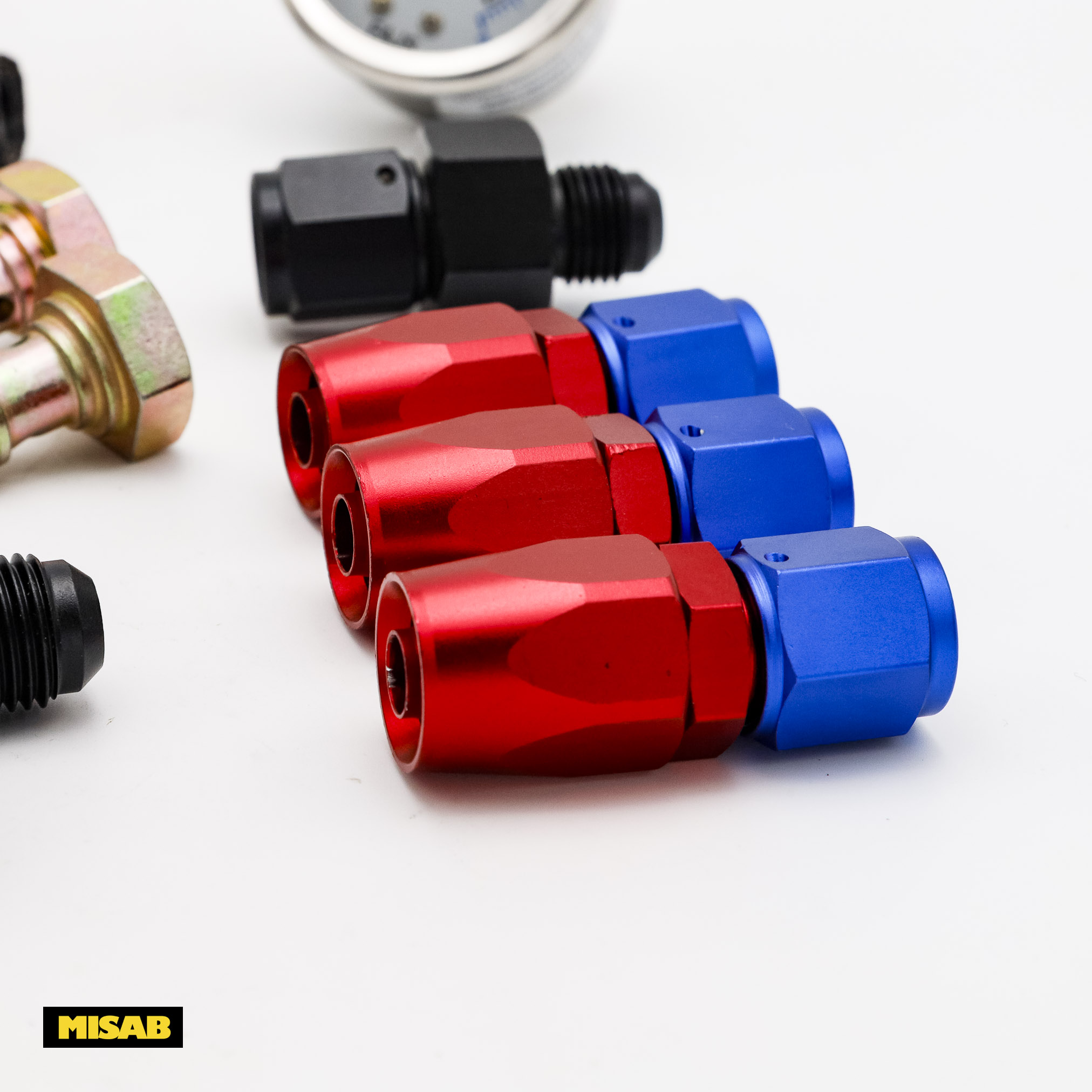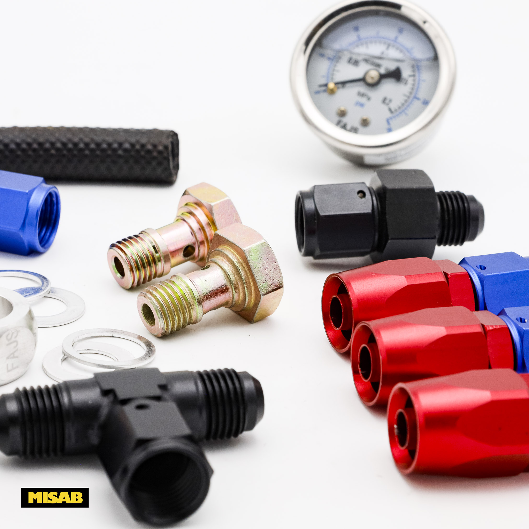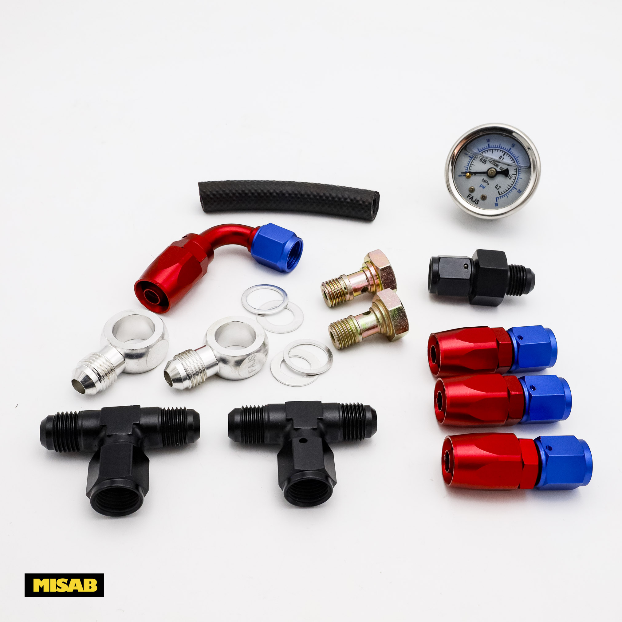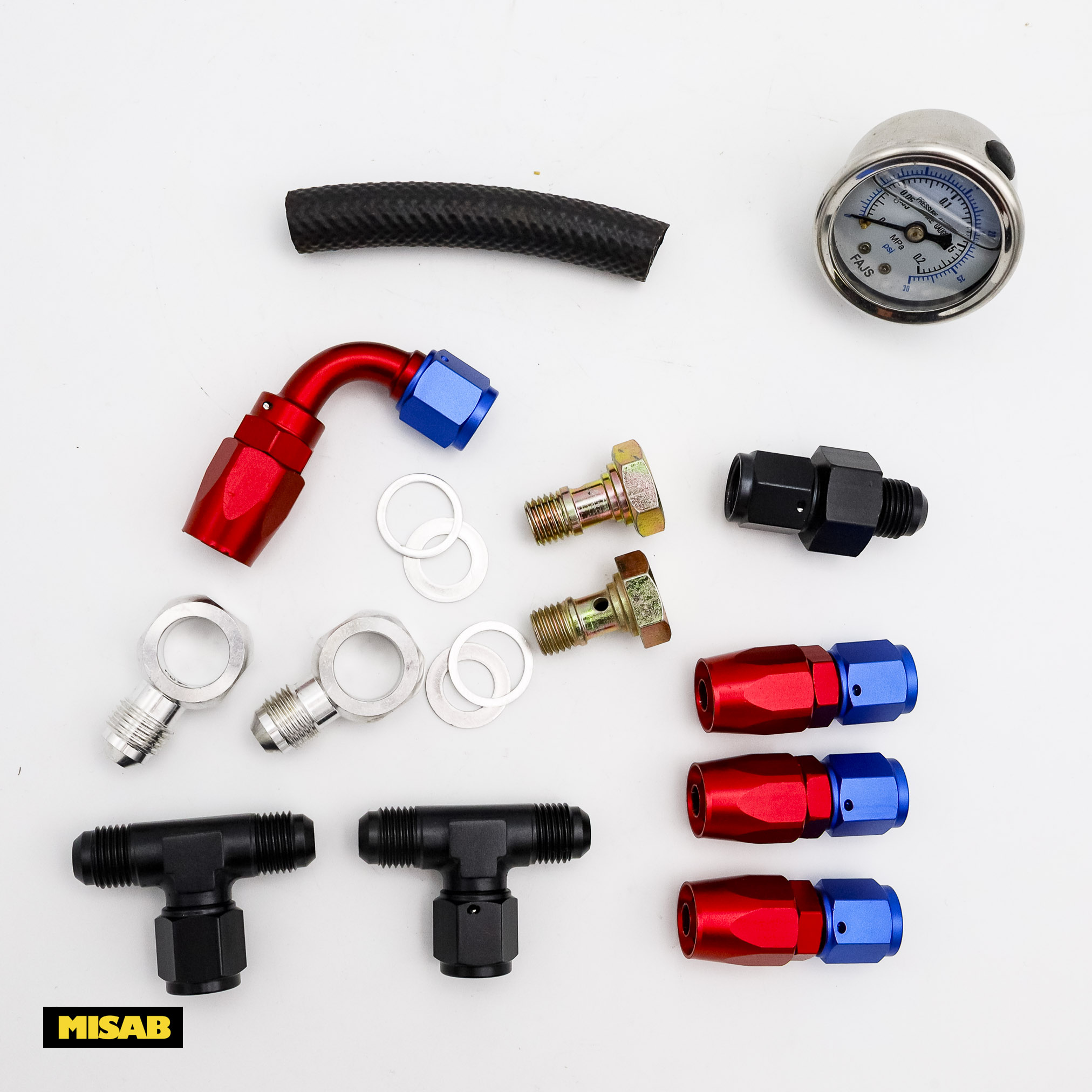 Satsen ger inte bara motorutrymmet ett professionellt "racing-utseende" med sina röd/blå eloxerade detaljer, utan säkerställer också ett tätt och säkert flöde. Den medföljande bränsletrycksmätaren är graderad 0-15 PSI, vilket är idealiskt för att ställa in korrekt bränsletryck (Weber rekommenderar ofta ca 0,2-0,3 bar).